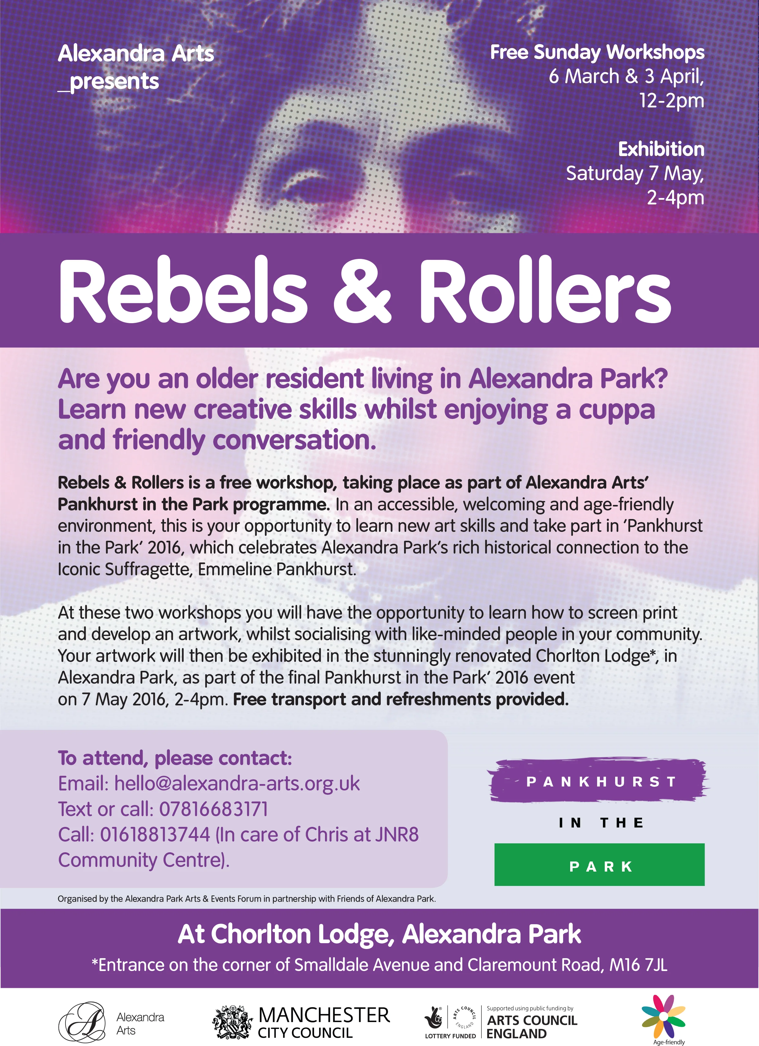 Then join us on Sunday 6 March for 'Rebels and Rollers', a free art workshop in the beautifully restored Chorlton Lodge in Alexandra Park, from 12-2pm. Free transport and refreshments will be provided, so do let us know if you would like to come.